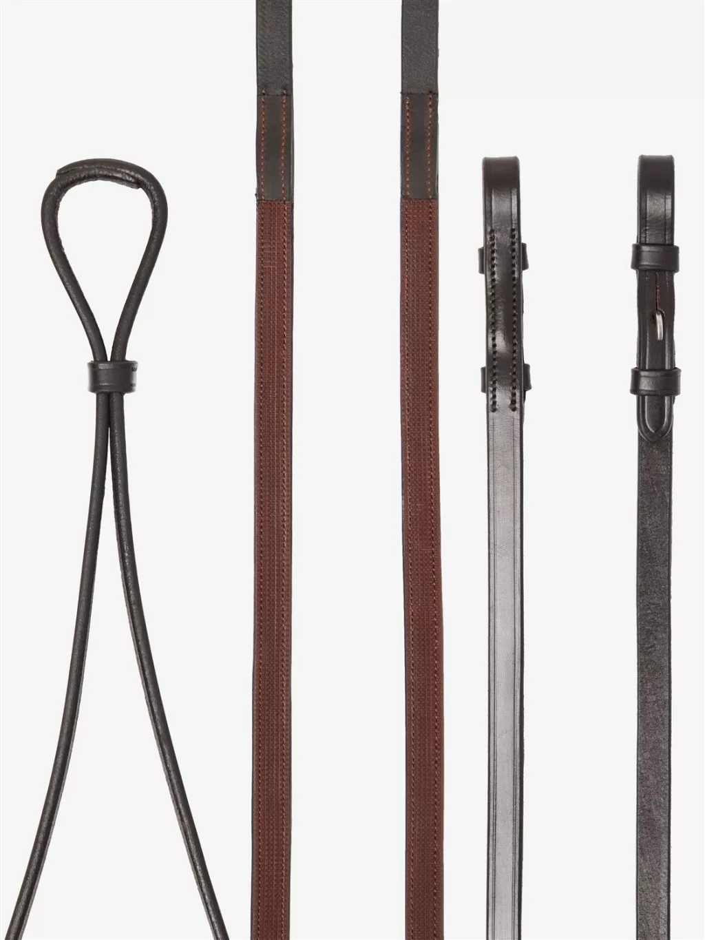 Curb reins lie thinner and flatter for reduced bulk in the hand, and are stitched rather than buckled at the centre join.