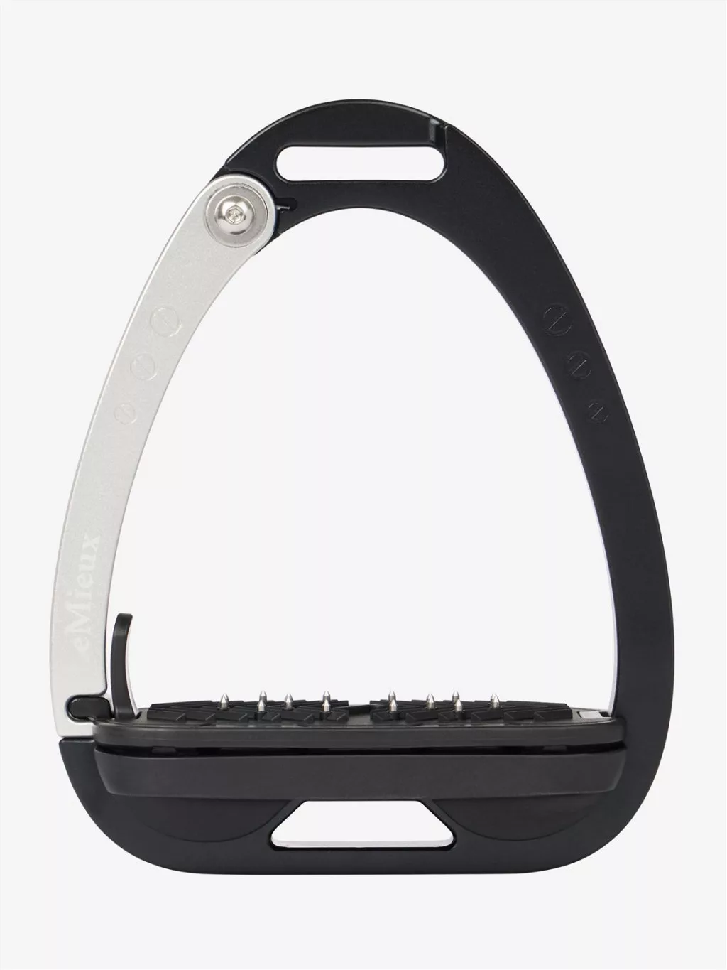 An integrated hinged arm has a two-stage release system, preventing unintentional opening. The spring-loaded arm locks into the base of the main frame meaning that when under maximum pressure, such as landing over a fence, the rider's weight is spread evenly across the stirrup, preventing the outside from dropping and flexing. When pressure is put onto the arm of the stirrup, the arm releases allowing the foot to come out of the stirrup, minimising the risk of dragging. The stirrup arm breakout force = 36N (equivalent to 3.62kg) in testing, meaning enough resistance to stop it from opening unintentionally, but will release when needed.