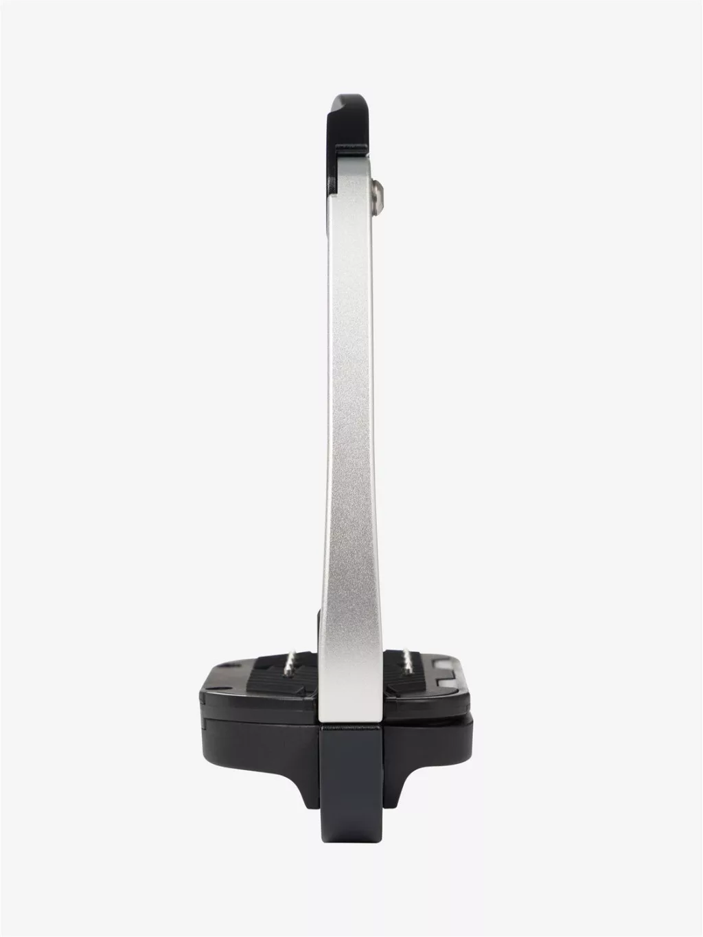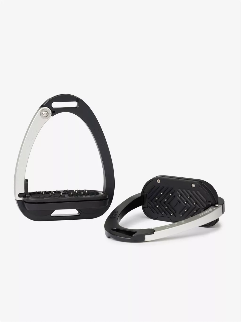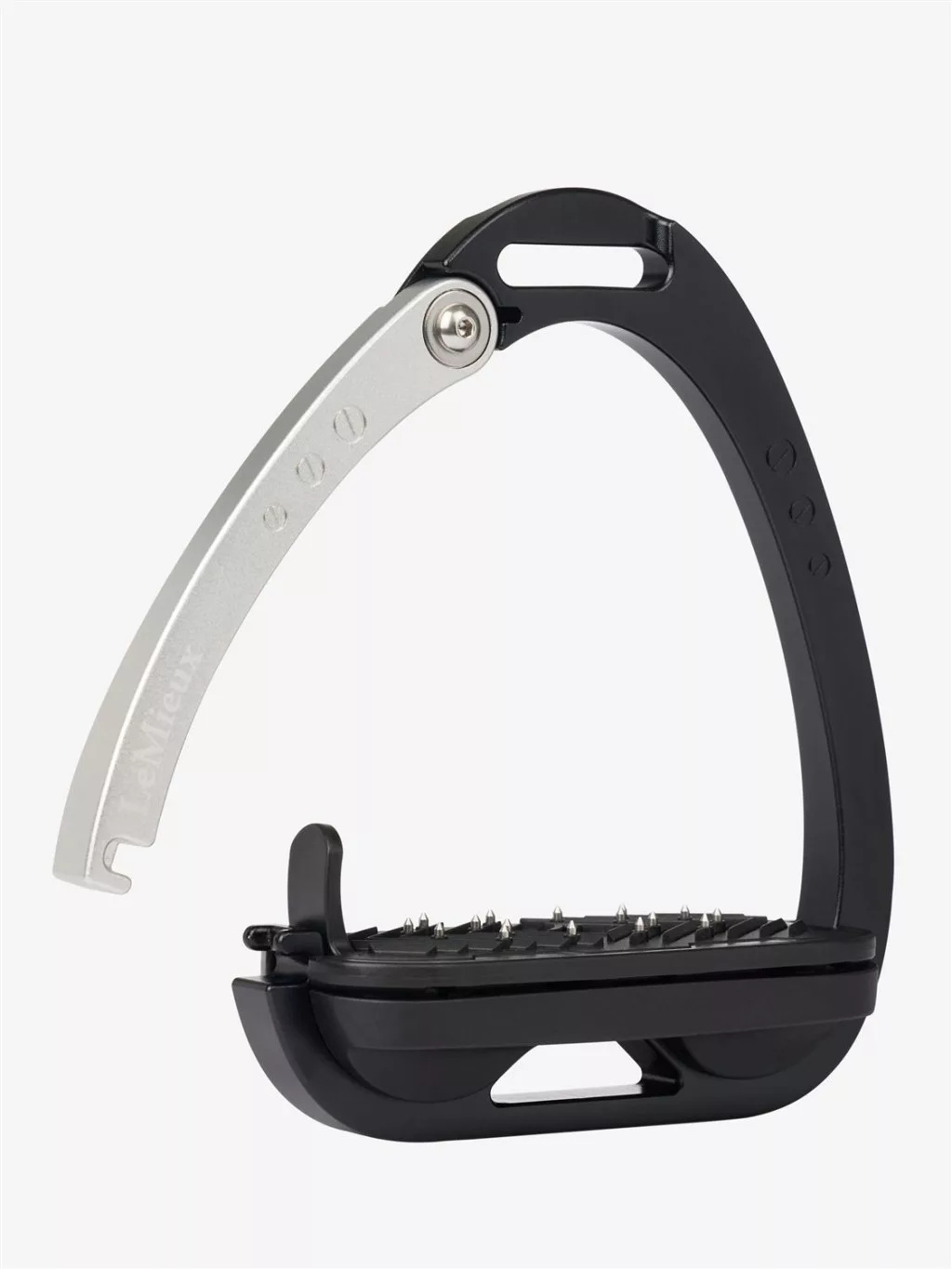 The ergonomic footplate of the Control Stirrup is set at 0° with a cross-track grip surface with embedded hardened steel pins to provide maximum security for the boot.
