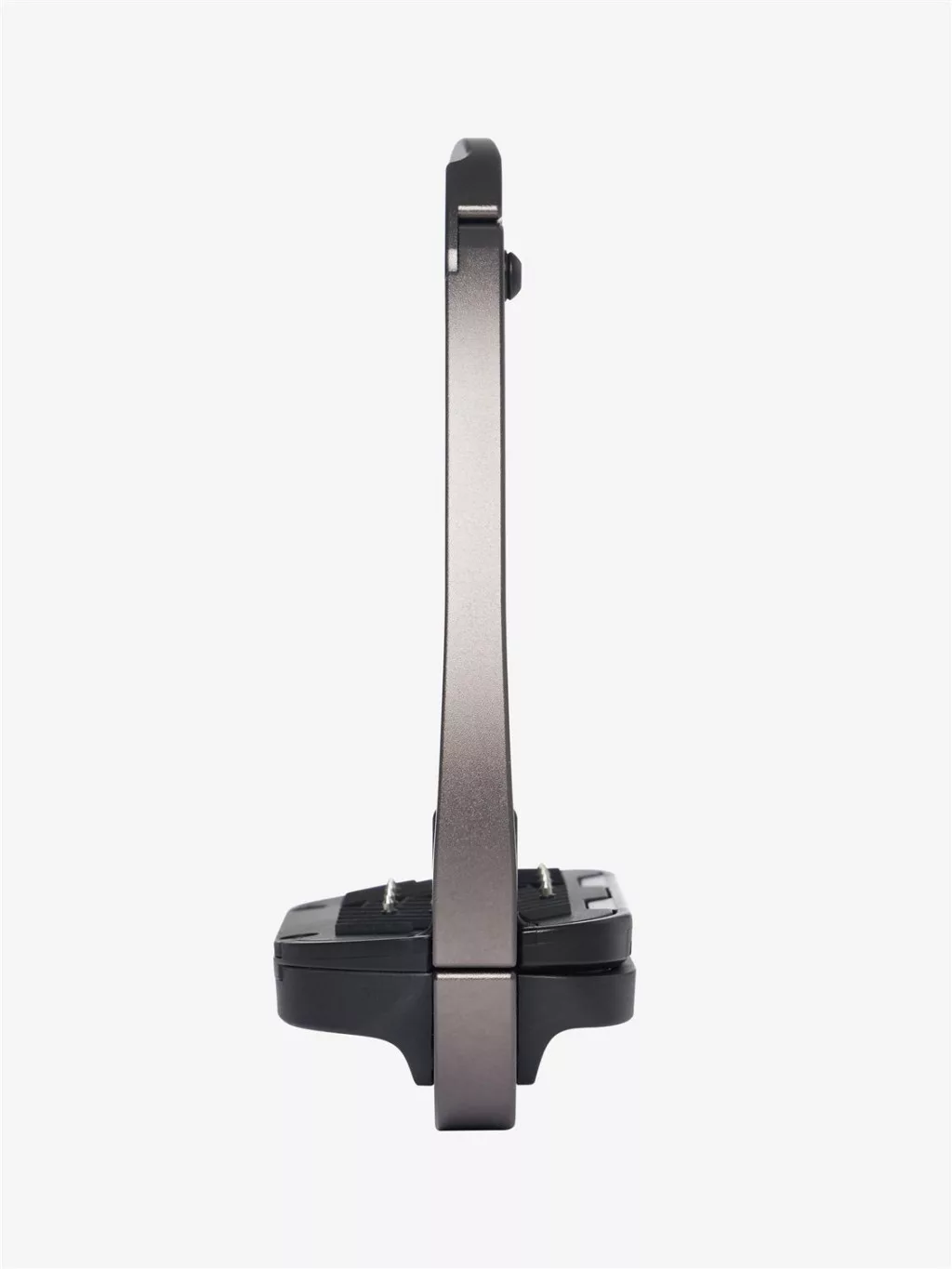 The ergonomic footplate of the Balance Stirrup is set at 5°, featuring a cross-track grip surface with embedded hardened steel pins, to enable lower leg stability, keeping the heels down.