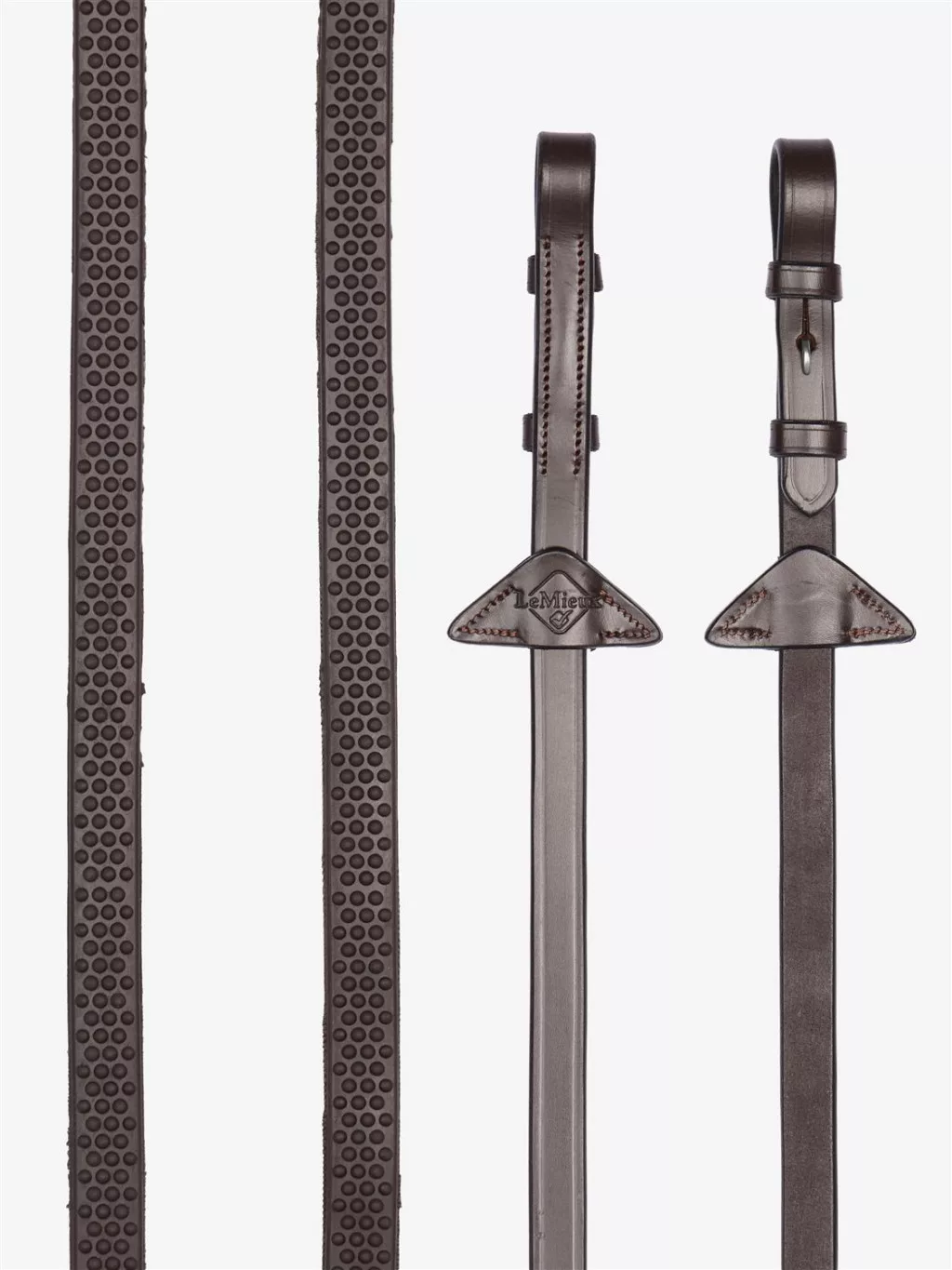 The LeMieux Soft Rubber Reins are beautifully soft and flexible reins that have a light feel in the riders' hands. With raised pimple texture for additional grip and nylon lining to prevent stretching. On Havana and Chestnut colourways, the rubber colour is Brown. Complemented by LeMieux branded leather martingale stoppers.