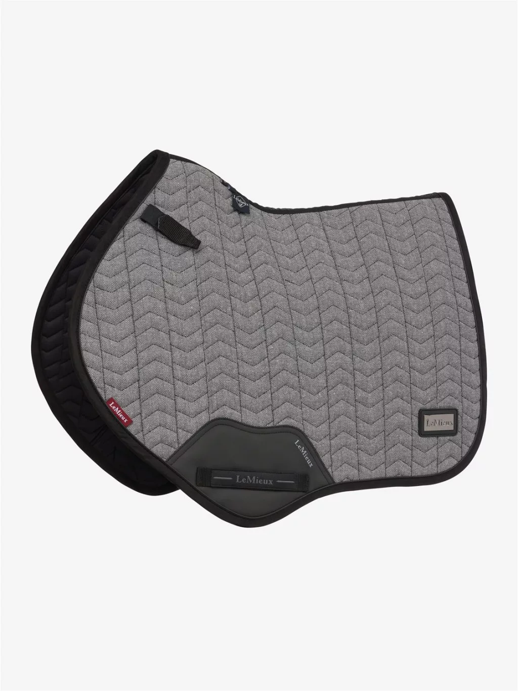 Express your style with this luxe saddle pad from the Aspen Collection. Crafted in a premium herringbone fabric, it has a sporty chevron quilting pattern with an athletic and elevated feel. Patent PU piping catches the light, and a gunmetal LeMieux badge matches back to the rest of the Aspen Collection.