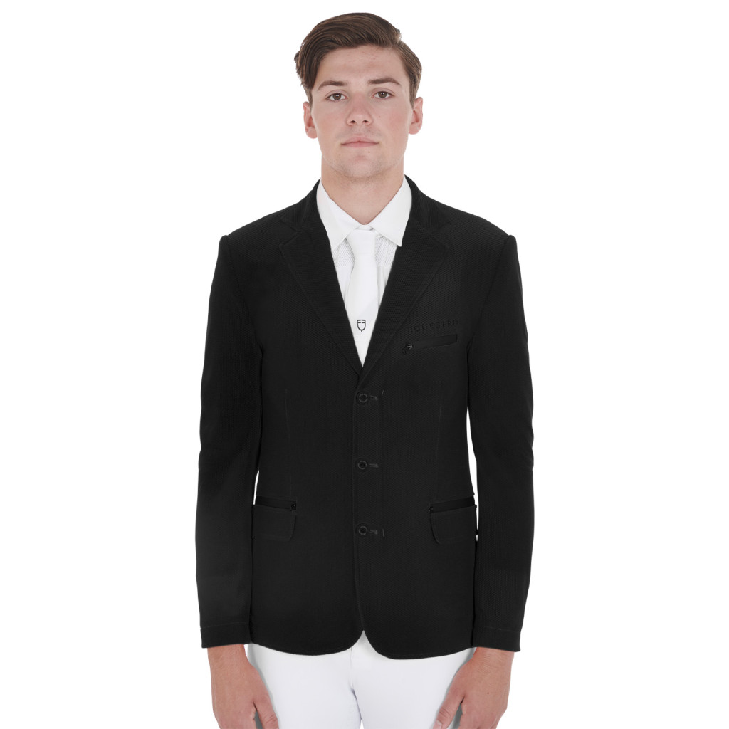 férfi versenyzakóval! Ez a három gombos, perforált anyagból készült zakó nemcsak elegáns, hanem rendkívül kényelmes is, így tökéletes választás a versenyekhez.