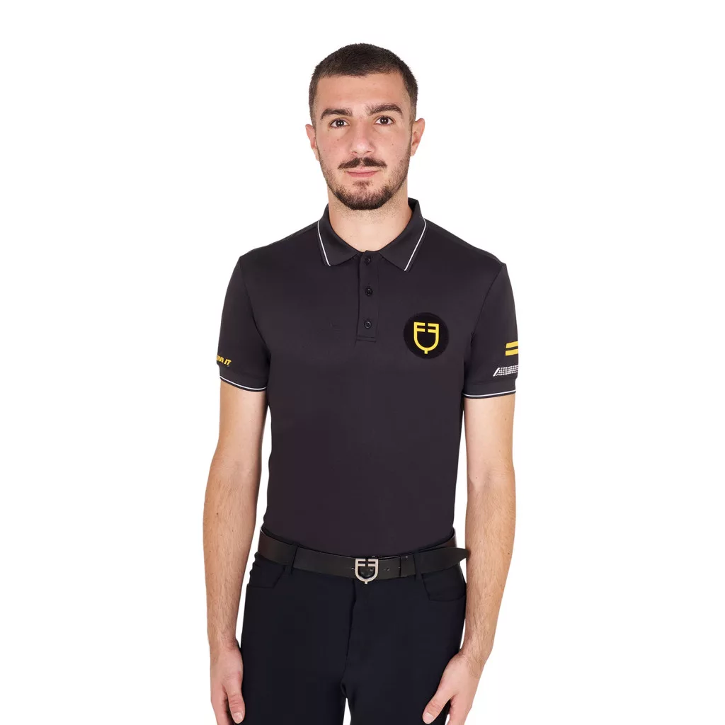 Férfi Scuderia Equestro kollekciós technikai tréning pólóEz a póló tökéletes választás a lovasok számára, akik stílusosan és kényelmesen szeretnének edzeni. A Scuderia Equestro kollekció minden részletére figyelmet fordít, így a póló nemcsak divatos, hanem funkcionális is.