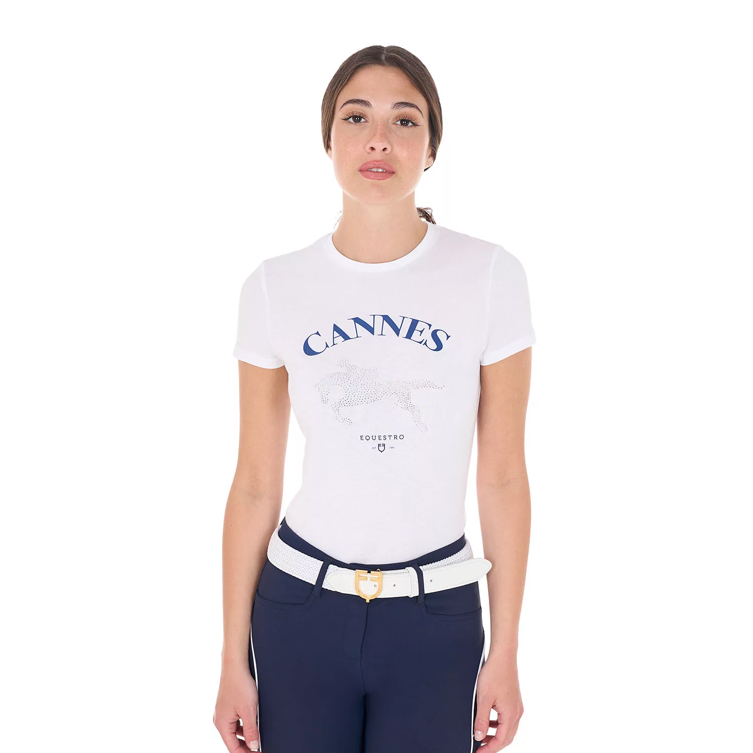 Női Cannes pamut pólóval, amely strasszokkal díszített! Ez a póló nemcsak divatos, hanem rendkívül kényelmes is, így tökéletes választás mindennapi viseletre vagy különleges alkalmakra is.