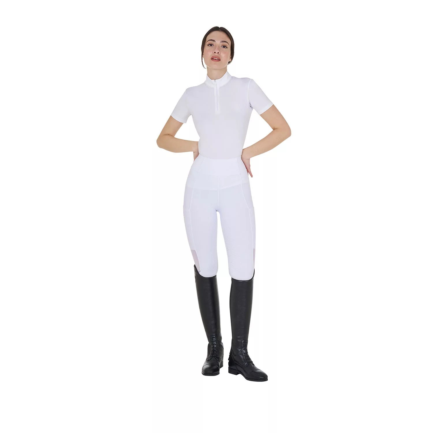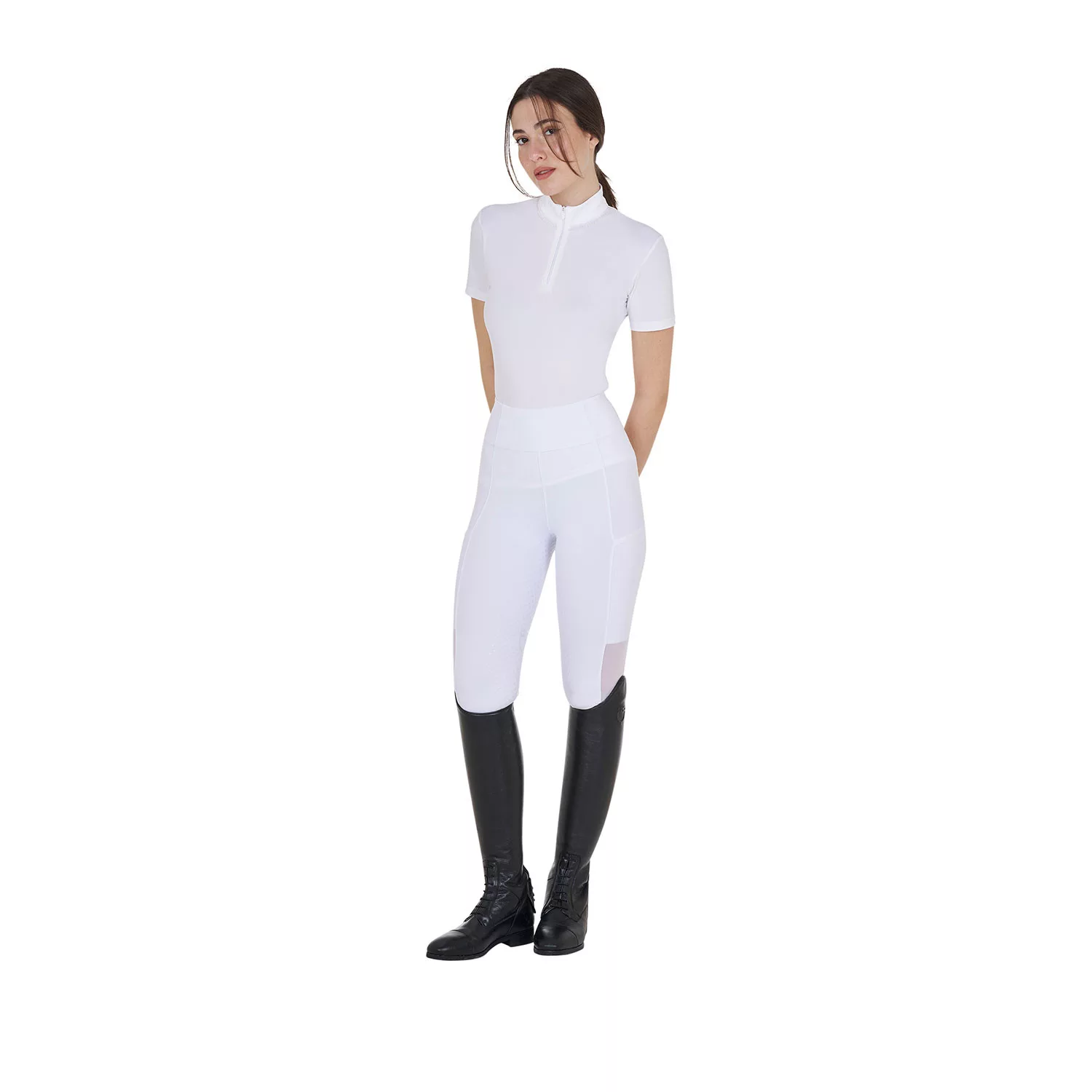 A póló elegáns gyöngyökkel díszített gallérral rendelkezik, amely különleges stílust kölcsönöz.