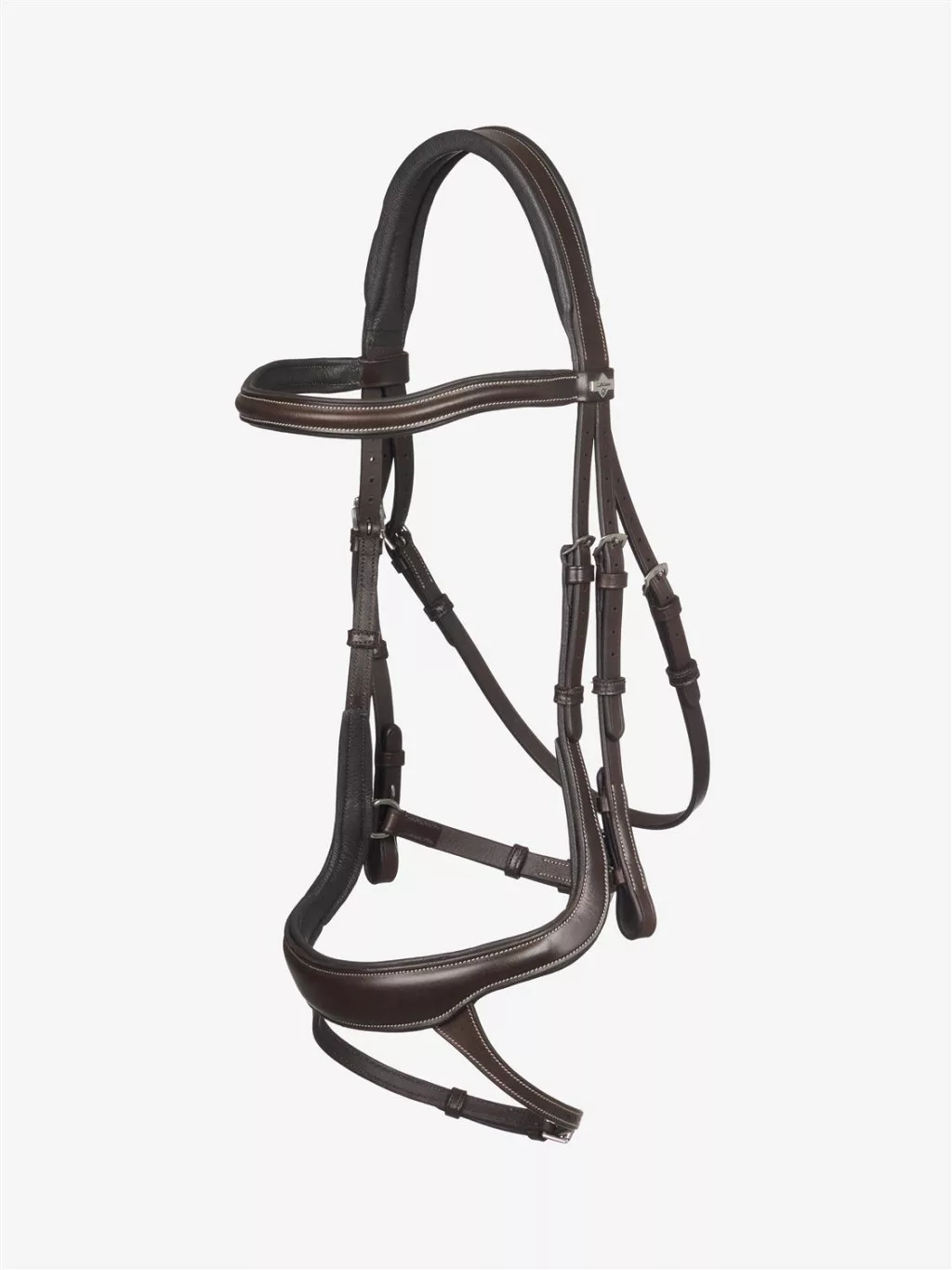This bridle features a lightly padded anatomical noseband and browband that offers protection and even pressure distribution. The lower noseband sits clear of the bit, with a similar action to a drop.
