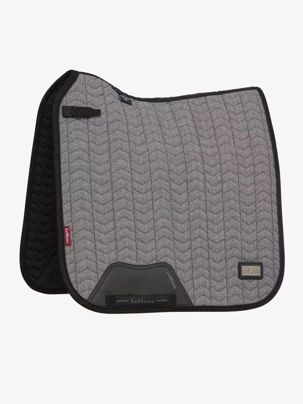 Express your style with this luxe saddle pad from the Aspen Collection. Crafted in a premium herringbone fabric, it has a sporty chevron quilting pattern with an athletic and elevated feel. Patent PU piping catches the light, and a gunmetal LeMieux badge matches back to the rest of the Aspen Collection.