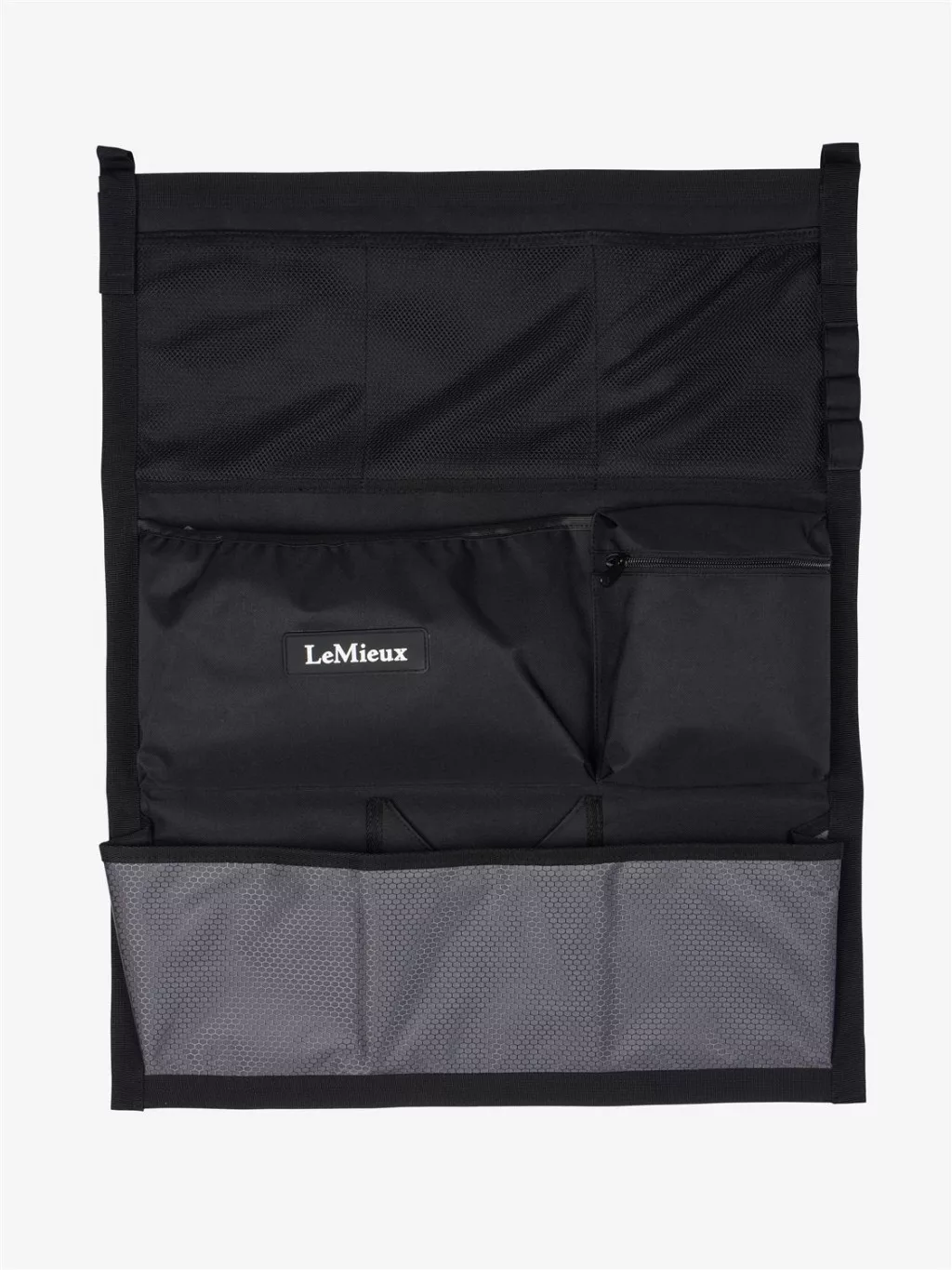 Create extra wall storage with this clever hanging organiser. Large, sturdy pockets are ideal for stashing treats, brushes, gloves, hoof picks, boots, vet wrap...!A combination of elasticated mesh pockets, open pockets and a more secure zipped pocket back onto sturdy fabric that will take the load with ease. It hangs up with two easy-to-shift hook and loop webbing straps for go-anywhere convenience.