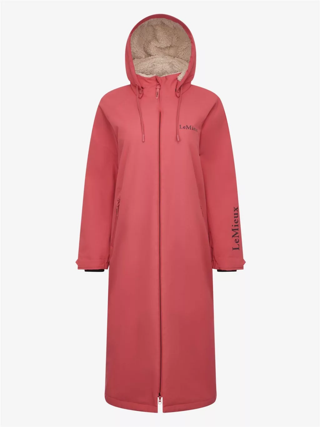 Shelter from the storm in this full-length, oversized, waterproof coat with a moisture-wicking fleece lining. Perfect for riding, changing and even running errands, it's big enough to throw on over clothing and cosy enough to dry off in. It's waterproof to 12,000mm with fully welded seams, inner storm cuffs, and a detachable hood. The breathable fabric has a 10,000mvp rating - ideal for working hard without overheating. There's plenty of pocket space for warming your hands and stashing treats in the deep zipped pockets.A two-way front zip gives you flexibility, while the back hem vent allows for fitting over the saddle. The PFC-free outer fabric is durable and ideal for life with horses.With statement LeMieux branding print and all the finishing touches you expect from LeMieux, this is the best way to stay dry - or dry off - on a wet ride.