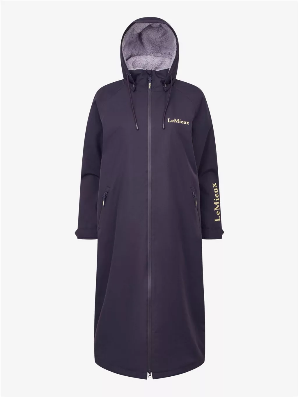Shelter from the storm in this full-length, oversized, waterproof coat with a moisture-wicking fleece lining. Perfect for riding, changing and even running errands, it's big enough to throw on over clothing and cosy enough to dry off in. It's waterproof to 12,000mm with fully welded seams, inner storm cuffs, and a detachable hood. The breathable fabric has a 10,000mvp rating - ideal for working hard without overheating. There's plenty of pocket space for warming your hands and stashing treats in the deep zipped pockets.A two-way front zip gives you flexibility, while the back hem vent allows for fitting over the saddle. The PFC-free outer fabric is durable and ideal for life with horses.With statement LeMieux branding print and all the finishing touches you expect from LeMieux, this is the best way to stay dry - or dry off - on a wet ride.