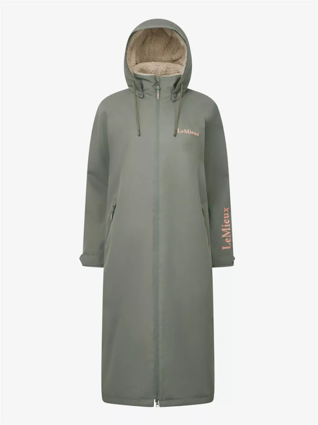 Shelter from the storm in this full-length, oversized, waterproof coat with a moisture-wicking fleece lining. Perfect for riding, changing and even running errands, it's big enough to throw on over clothing and cosy enough to dry off in. It's waterproof to 12,000mm with fully welded seams, inner storm cuffs, and a detachable hood. The breathable fabric has a 10,000mvp rating - ideal for working hard without overheating. There's plenty of pocket space for warming your hands and stashing treats in the deep zipped pockets.A two-way front zip gives you flexibility, while the back hem vent allows for fitting over the saddle. The PFC-free outer fabric is durable and ideal for life with horses.With statement LeMieux branding print and all the finishing touches you expect from LeMieux, this is the best way to stay dry - or dry off - on a wet ride.