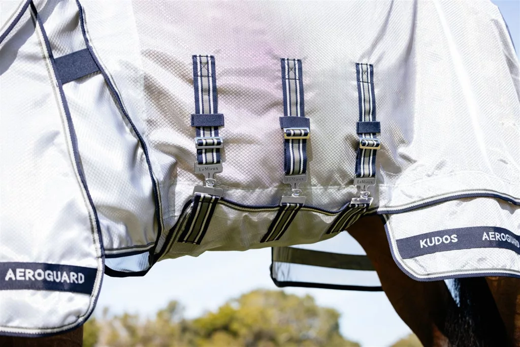The Kudos AeroGuard Fly Rug is the ultimate technical fly defence. Crafted in ripshield mesh, it's engineered in durable nylon and monofilament polyester for a structure that shapes around your horse's body to protect them from flies. The structured yet lightweight ripshield mesh makes this fly rug highly breathable, naturally repelling water and encouraging rapid drying. The extended, shaped belly flap maximises coverage and features a three-strap closure with a detachable central strap that helps to self-right the rug.The trigger clip front fastening system makes for easy rug changes. Antibacterial and anti-static lined, it's ideal for all-day comfort. Our patented two-part skirt provides a break in the hemline and relieves tension allowing for a greater range of movement.For the best fit on a 'fuller across the belly' or deeper-chested horse, size up.