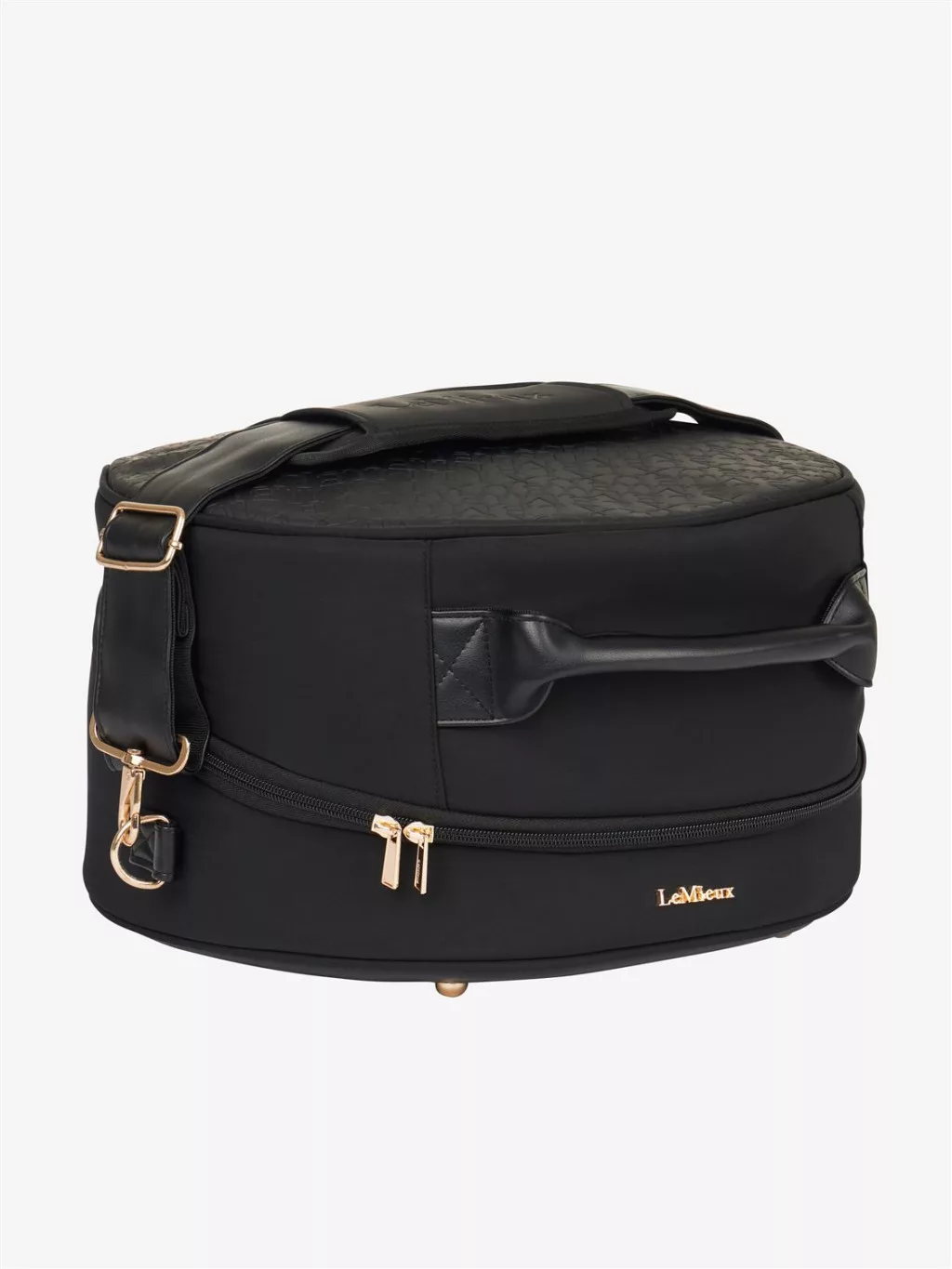 This luxurious hat box is perfect for storage at the yard or travelling to clinics and shows. The super soft quilted faux fur lining keeps your hat clean and protected.Designed for elegance and practicality, there's a detachable shoulder strap and comfortable rolled faux leather handle.An internal air-vented compartment stores your gloves, with an additional pocket for hair nets and accessories. The large double zip clam shell opening offers easy access.The Luxe Hat Box coordinates with the Luxe Luggage range, ideal for competitive riders.