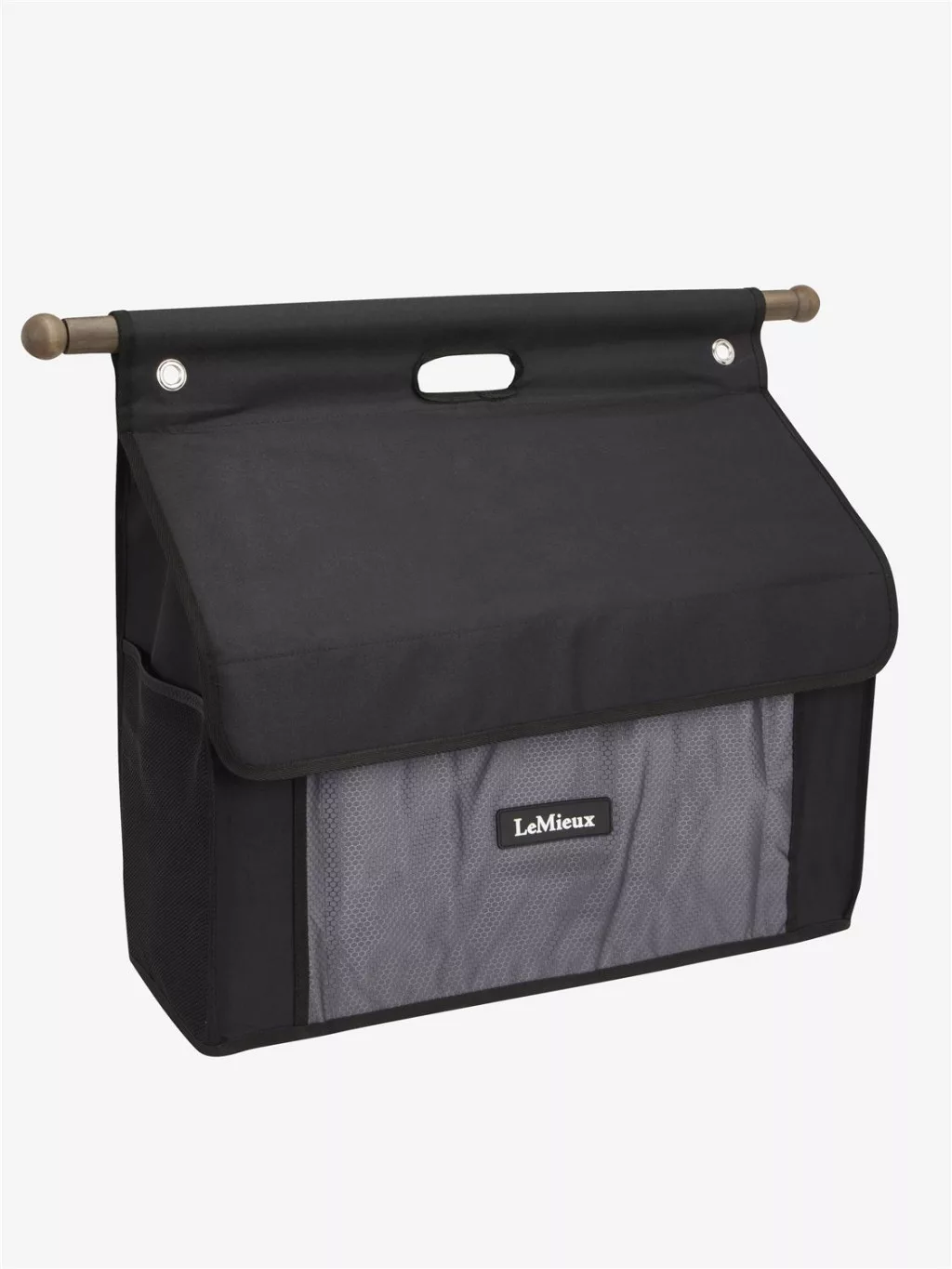 Take this large structured grooming bag with you when you travel to set up your home-from-home show stable. A 65cm wooden bar supports the bag when it's being carried or hung up. Large mesh pockets on the sides are ideal for storing treats or brushes.Metal-lined eyelets are helpful for hanging up. Its generous capacity is the perfect size for more oversized items, such as rugs and saddle pads, to keep them neat, clean and dry.