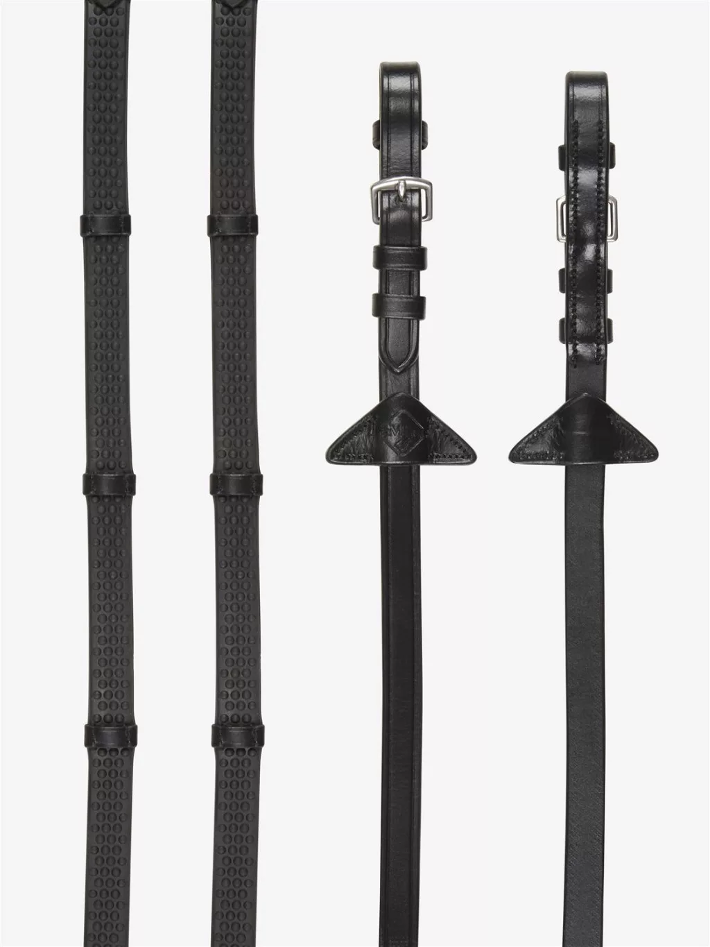 Simple and easy to use, these reins are a popular choice for lower-level riders or fast work. They're complemented by the branded LeMieux Leather martingale Stoppers.