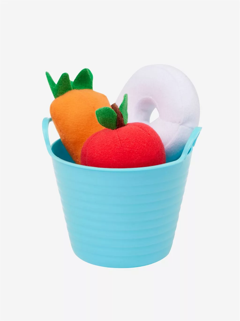 Delicious goodies within this plastic treat bucket include a soft fabric carrot, apple, and mint, each with a hook and loop spot to attach to your Toy Pony's mouth. Crunch, munch, time for lunch!
