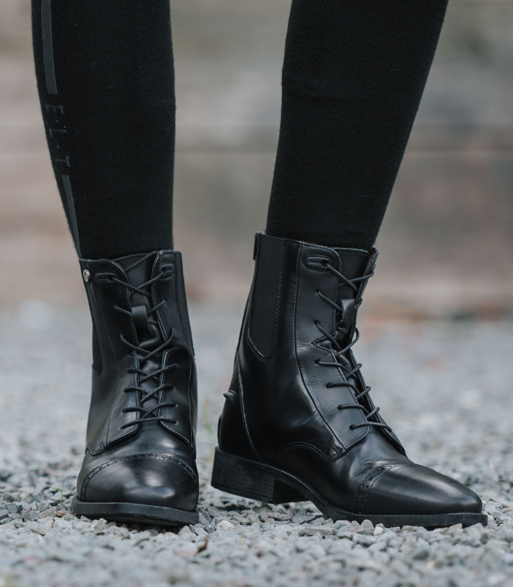 Elegáns megjelenésű, a lábfejnél fűzős lovaglócipő. Könnyen fel- és levehető a hátulsó cipzárnak köszönhetően. Kényelmes rugalmas betétekkel és lábfejnél található fűző a tökéletes illeszkedésért.