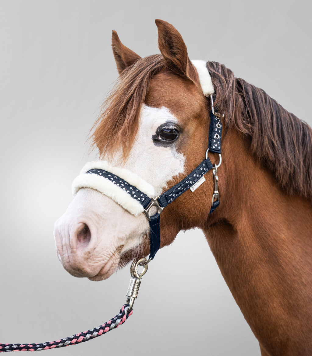 Waldhausen Lucky kötőfék vezetőszárral puhán, műszőrrel bélelt orr- és tarkószíjjal, aranyos lovacskás mintával díszítve. Hozzá illő vezetőszárral szállítjuk. A teljes szett kiegészítéséhez válaszd a Waldhausen Lucky kollekció további temrékeit!