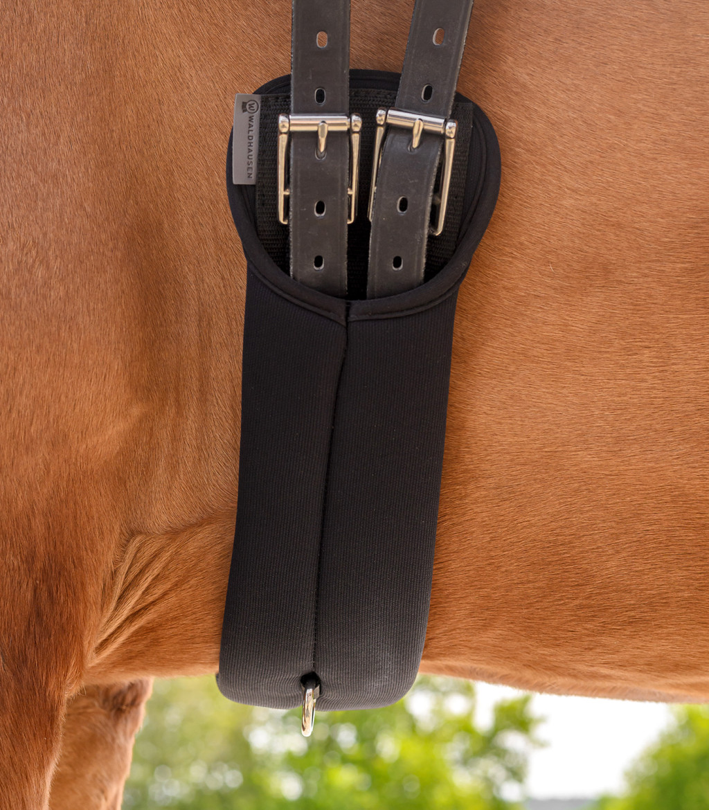 Memóriahabos díjlovas heveder. A különösen puha és vastag anyag ideális mozgásszabadságot tesz lehetővé. Megakadályozza a feltörést. Rozsdamentes acél csatokkal és középen D-gyűrűvel. Nem elasztikus.