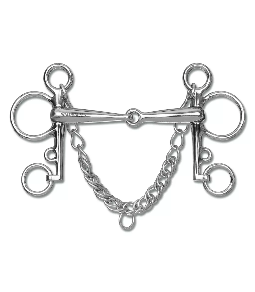Rozsdamentes acélból készült pelham zabla, zablalánccal.