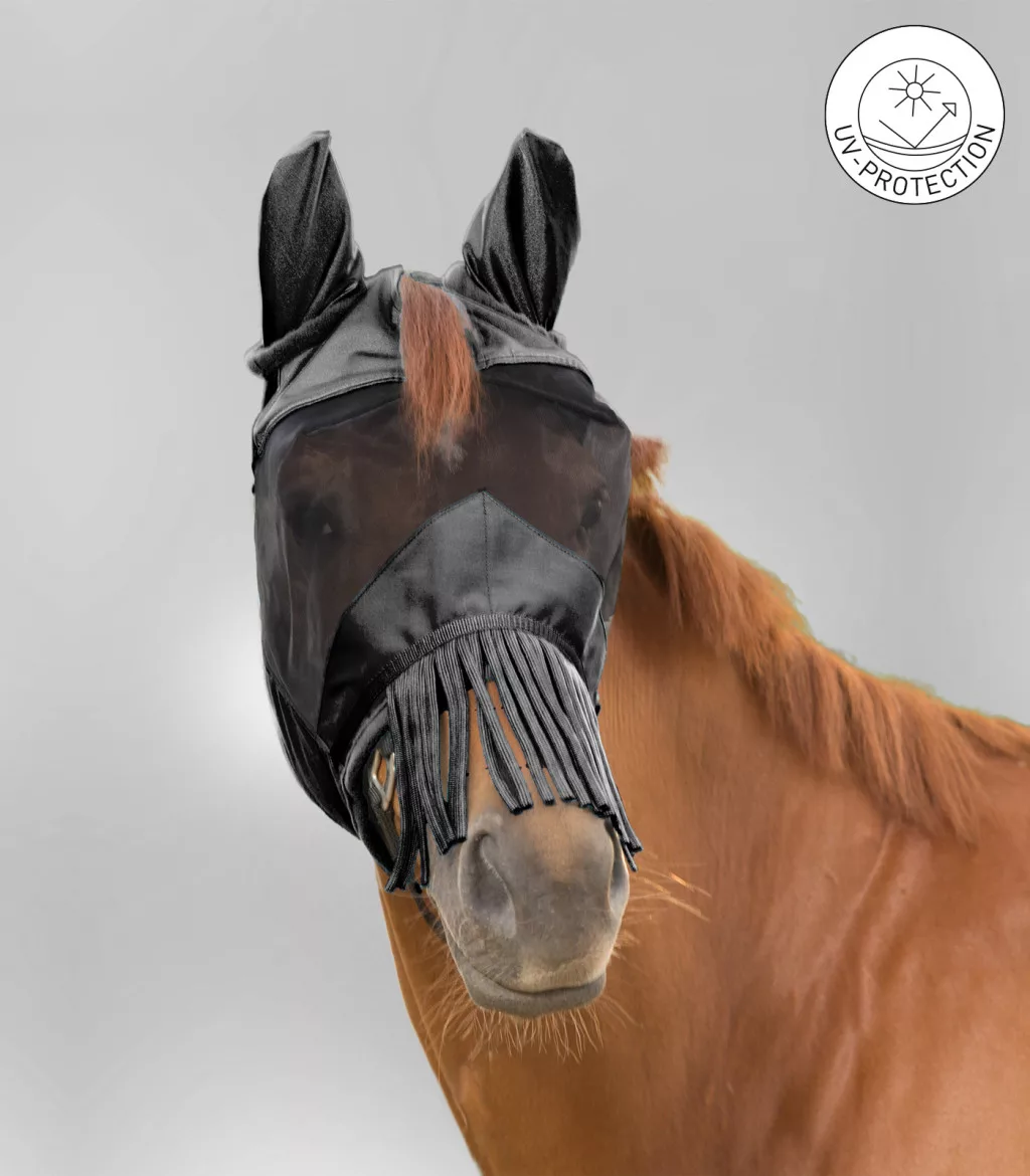 UV-védelemmel ellátott füles légymaszk sallanggal kiegészítve az orrnál. Tökéletes illeszkedés a rugalmas betéteknek és a tépőzárnak köszönhetően.