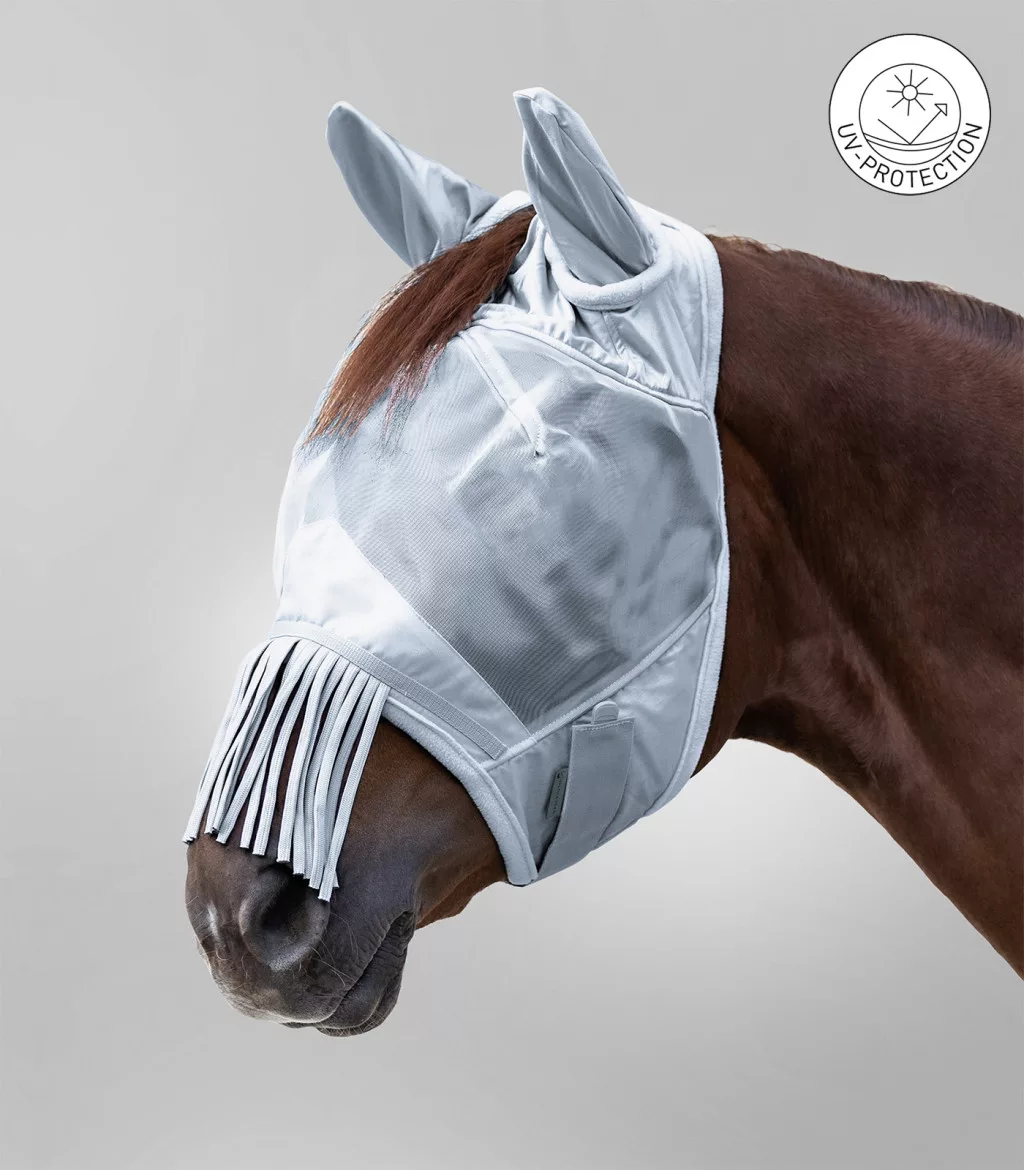 UV-védelemmel ellátott füles légymaszk sallanggal kiegészítve az orrnál. Tökéletes illeszkedés a rugalmas betéteknek és a tépőzárnak köszönhetően.
